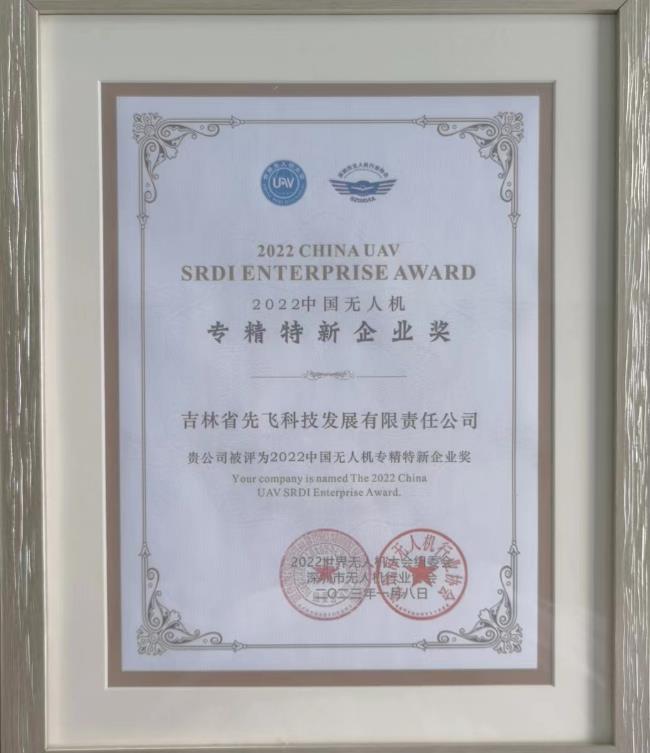 2022年中國無人機行業面臨疫情背景下的嚴峻考驗,在眾多行業內企業的推動與支持下,無人機行業仍取得了長足性發展。大會特此設立多個獎項以表彰為中國無人機行業發展做出杰出貢獻企業和各界人士,吉林省先飛科技發展有限責任公司有幸被獲評為“2022中國無人機專精特新企業獎”。